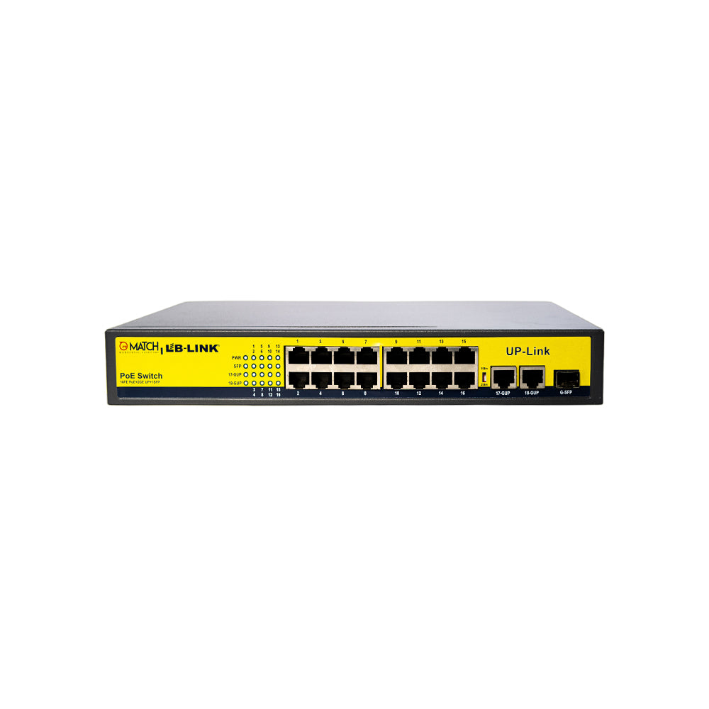 This MATCH LB-LINK 16 Port 10/100Mbps PoE Switch with 2 Giga uplink ports and 1 Fibre ports. Get this 16 port PoE installed easily. Transmit your data faster and safer.