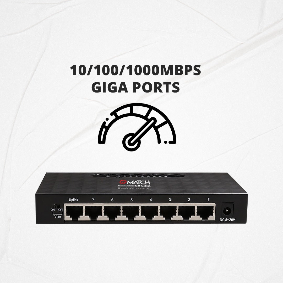 8 Port Gigabit Ethernet Switch 10/100/1000Mbps provides 10 times faster speed than normal 10/100mbps ethernet switch. No need to configure this network switch, Just plug and play. Supports VLAN Indicators and 5-20Volts.